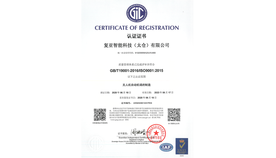 近日,經過全面、嚴格、細致地審核,復亞智能科技有限公司(以下簡稱復亞智能)通過國際標準認證ISO9001:2015的“無人機自動機場的制造”質量管理體系認證,標志著復亞智能在無人機自動機場的制造已達到國際質量認證標準。