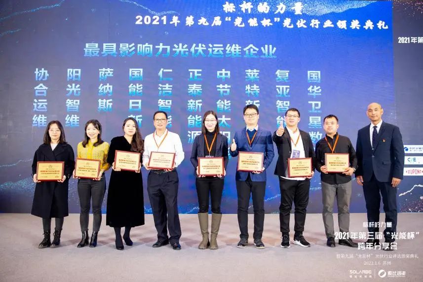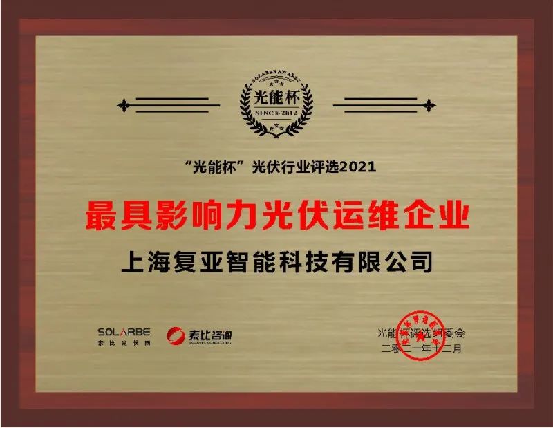 近日,由索比光伏網、索比咨詢聯合主辦的2021年度第三屆“光能杯”跨年分享會暨第九屆“光能杯”行業頒獎典禮在蘇州盛大舉辦。本屆“光能杯”共有300余家光伏企業參與報名評選。復亞智能憑借落地于多省份的30余套無人機光伏自動巡檢系統,獲得2021年“最具影響力光伏運維企業”稱號。